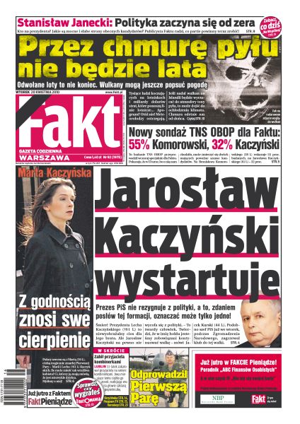 Prezes PiS nie rezygnuje z polityki, a to – zdaniem posłów tej formacji – oznaczać może tylko jedno; poruszające zdjęcie z wnętrza krypty, gdzie chowano Prezydencką Parę; choć Marta Kaczyńska jest pogrążona w rozpaczy po stracie rodziców, dzielnie wypełnia smutne obowiązki; wulkan Eyjafjoell na Islandii nie osłabia swojej aktywności; Piotr i 13-letnia Ala jechali 12 godzin na Wawel, by oddać ostatni hołd Prezydenckiej Parze; Weronika Rosati to naprawdę ambitna i zdolna dziewczyna, ale wciąż musi się dużo uczyć; żona pilota Monika Richardson mówi po katastrofie pod Smoleńskiem; po wpadce Fabiańskiego w meczu z Wigan angielskie media wyśmiewają polskiego bramkarza; wczoraj swą ostatnią drogę przebył przyjaciel sportowców Piotr Nurowski.