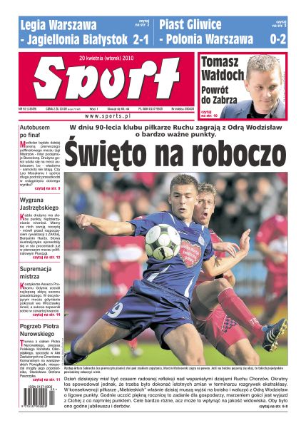 W dniu 90-lecia klubu piłkarze Ruchu zagrają z Odrą Wodzisław o bardzo ważne punkty; stadion przy ulicy Konwiktorskiej okazał się szczęśliwy dla Legii, która zrewanżowała się Jagiellonii za porażkę w rundzie jesiennej; niebiesko-czerwoni to dziś drużyna z jedną z największych średnich wiekowych pierwszej jedenastki w lidze; mija już niemal rok od ostatniej wygranej wrocławian na wyjeździe; 20 kwietnia 1920 roku rozpoczęła się barwna i niepowtarzalna historia Ruchu Chorzów, znanego każdemu kibicowi „kopanej” w Polsce; po raz drugi w tej edycji rozgrywek los skojarzył Inter i Barcelonę; Tomasz Wałdoch po szesnastu latach wrócił do Zabrza; bramka Wojtka Wolskiego przyczyniła się do sensacyjnej porażki Detroit; ponad tysiąc osób – kierowców, członków teamów, oficjeli i dziennikarzy – czeka w Chinach, by wrócić do Europy po ostatnim GP Formuły 1.