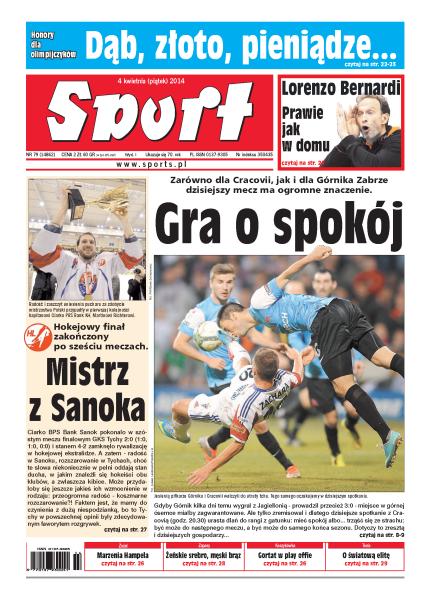 Gra o spokój: zarówno dla Cracovii, jak i dla Górnika Zabrze dzisiejszy mecz ma ogromne znaczenie; honory dla olimpijczyków: dąb, złoto, pieniądze; hokejowy finał zakończony po sześciu meczach: mistrz jest z Sanoka; żeńskie srebro, męski brąz na zapaśniczych mistrzostwach Europy; rozmowa z Lorenzo Bernardim, trenerem Jastrzębskiego Węgla; marzenia Hampela przed jutrzejszym startem cyklu Grand Prix; Washington Wizards, drużyna Marcina Gortata, zagra w fazie play off; zaczynamy grę o światową elitę tenisa.