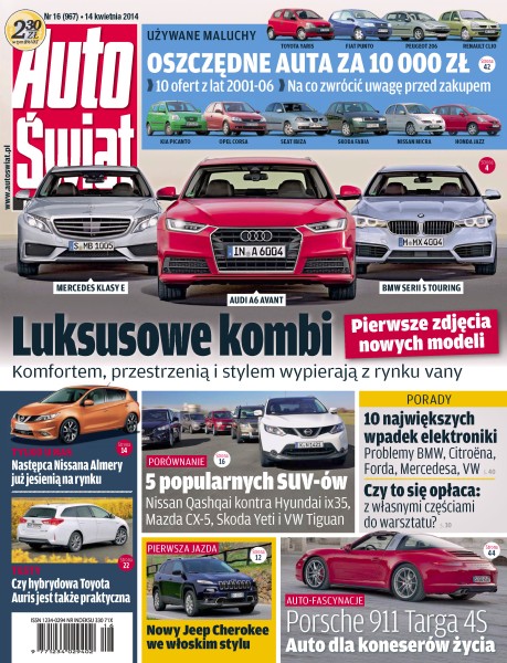 Luksusowe kombi – komfortem, przestrzenią i stylem wypierają z rynku vany – pierwsze zdjęcia nowych modeli; oszczędne auta za 10 000 zł – 10 ofert z lat 2001-06, na co zwrócić uwagę przed zakupem; 5 popularnych SUV-ów – Nissan Qashqai kontra Hyundai ix35, Mazda CX-5, Skoda Yeti i VW Tiguan; 10 największych wpadek elektroniki – problemy BMW Citroena, Forda, Mercedesa, VW; następca Nissana Almery już jesienią na rynku – odkąd w 2006 roku zakończono produkcję Almery, Nissan nie miał typowego przedstawiciela w klasie C; Jeep Cherokee – średniej wielkości SUV-y to obecnie jeden z największych fragmentów rynku 4x4, Cherokee przekonuje m.in. własnościami terenowymi.