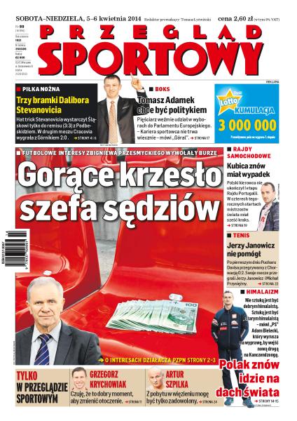 Gorące krzesło szefa sędziów: futbolowe interesy Zbigniewa Przesmyckiego wywołały burzę; hat trick Dalibora Stevanovicia wystarczył Śląskowi tylko do remisu (3:3) z Podbeskidziem, w drugim meczu Cracovia wygrała z Górnikiem 2:0; Tomasz Adamek chce być politykiem – pięściarz weźmie udział w wyborach do Parlamentu Europejskiego; Kubica znów miał wypadek: polski kierowca nie ukończył I etapu Rajdu Portugalii; Jerzy Janowicz nie pomógł: po pierwszym dniu Pucharu Davisa przegrywamy z Chorwacją 0:2, swój mecz przegrał bowiem także Michał Przysiężny; nie sztuką jest być dobrym himalaistą, sztuką jest być starym himalaistą – mówi „PS” Adam Bielecki, który wyrusza na wyprawę, by wejść nową drogą na Kanczendzongę; kobieca kadra futbolowa walczy w sobotę z liderkami grupy o awans do mistrzostw świata; podnoszenie ciężarów: Polska na mistrzostwa Europy z największymi gwiazdami; w niedzielę startuje 98. edycja wyścigu Dookoła Flandrii; rozmowa z Arturem Szpilką.
