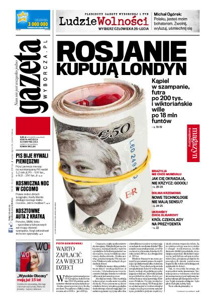 Rosjanie kupują Londyn: kąpiel w szampanie, futra po 200 tys. i wiktoriańskie wille po 18 mln funtów; Brazylia nie chce mundialu; czy nowe technologie nie mają sensu; Ukraińcy chcą oligarchy na prezydenta; przez pierwszy miesiąc na eurokampanię PiS wydał 1,2 mln zł, PO – 500 tys., a SLD – 250 tys. zł; prawie milion złotych ściągnęła z karty klienta obsługa nocnego klubu Cocomo – jak to możliwe; Porsche, BMW, Volvo – sprzedawcy luksusowych aut mogą otwierać szampana, bo rząd zafundował im boom sprzedaży; jak zachęcić Polaków do posiadania dzieci: politycy uznali, że najlepsza droga wiedzie przez... podatki; 20 lat temu Kurt Cobain zażył heroinę i strzelił sobie w głowę – dlaczego lider Nirvany wydaje się postacią z tak odległej epoki.