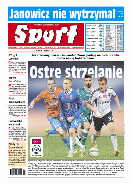 Jagiellonia pokazała antyfutbol i to, że w obecnej formie na miejsce w grupie mistrzowskiej nie zasługuje; Bayern Monachium, po 53 meczach bez porażki, przegrał spotkanie ligowe; Atletico bez udziału Diego Costy pokonało Villarreal, Real Madryt bez Cristiano Ronaldo wysoko wygrał w San Sebastian; ZAKSA Kędzierzyn-Koźle wyjechała z Rzeszowa z dwoma zwycięstwami i jest o krok od finału PlusLigi; Szwajcar Fabian Cancellara wygrał 98. edycję klasyka Dookoła Flandrii; Grand Prix Nowej Zelandii było pełne zaskakujących rozstrzygnięć, wygrał outsider Martin
