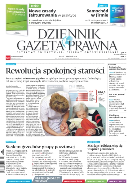 Emeryt zapłaci własnym majątkiem za opiekę w domu pomocy społecznej – gminy będą też skuteczniej ścigać krewnych, którzy nie chcą dopłacać do pobytu seniora; Kijów broni się przed zwolennikami Moskwy, którzy wczoraj ogłosili w Doniecku utworzenie nowej republiki; umowy cywilnoprawne zawarte przez Sąd Najwyższy mają charakter informacji publicznej; odsetki od bankowych depozytów są tak niskie, że nie opłaca się oszczędzać, tylko wydawać; dlaczego ubezpieczeni coraz rzadziej godzą się z niekorzystnymi decyzjami ZUS; prezesi sądów apelacyjnych przedstawili Ministerstwu Sprawiedliwości listę zastrzeżeń wobec Polskiej Grupy Pocztowej, która od stycznia odpowiada za doręczanie pism z sądów i prokuratur.
