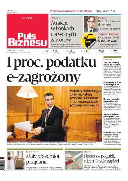 Atrakcje w bankach dla wolnych zawodów; wytyczne fiskusa mogą dotknąć wiele firm – mówi Mariusz Machciński; w teście ekonomii porównujemy dwie wersje audi A3; podatnicy niekorzystający z internetu lub ulg przestaną nas wspierać – alarmują organizacje pożytku publicznego; arabskie inwestycje w polskim sektorze stoczniowym okazały się baśnią tysiąca i jednej nocy; rząd ospale walczy ze złodziejami VAT; coraz więcej przybyszów zza wschodniej granicy podejmuje legalną pracę nad Wisłą; Onet nie odda pola aliansowi rywali; mały przedmiot pożądania – ideał ma 53 metry kwadratowe i dobrą lokalizację.
