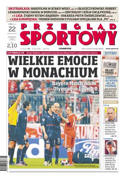 Zwycięską bramkę dla monachijczyków Arjen Robben zdobył strzałem zza pola karnego w drugiej połowie spotkania; w argentyńskim pojedynku Diego Milito przyćmił Leo Messiego – Inter jest już o mały krok od finału; Atletico Madryt i Liverpool zagrają bez największych gwiazd – Sergio Agüero i Fernando Torresa; etatowego stopera krakowian w spotkaniu z poznaniakami zastąpi Cleber lub Mariusz Jop; wywiad z Piotrem Świerczewskim, piłkarzem ŁKS Łódź; Tomasz Gollob może zostać mistrzem świata – Jarka Hampela też stać na medal; 15 maja w Łodzi rozegra się najdroższa walka w naszym kraju; wywiad z Michałem Winiarskim, przyjmującym PGE Skry Bełchatów; Witalij Pietrow w Chinach spodziewał się większego wsparcia ze strony Roberta Kubicy.