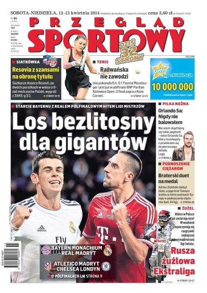 Bayern zmierzy się z Realem, a Atletico zagra z Chelsea – emocje równie wielkie jak w ćwierćfinałach gwarantowane; jeśli nie możesz kupić najlepszych zawodników, najlepszymi uczyń swoich piłkarzy – to złota zasada trenerów Atletico; czy w starciu Liverpoolu z Manchesterem City najważniejsi będą napastnicy; wojna Bayernu z Borussią zamiast na boisku, będzie w loży honorowej; Asseco Resovia odwróciła losy meczu, w którym ZAKSA była krok od awansu, i nadal walczy o tytuł; Agnieszka Radwańska wygrała ćwierćfinał z Yvonne Meusburger – w sobotę półfinał z Alize Cornet; Michał Kwiatkowski znowu trzeci – dzisiaj ostatni etap wyścigu – jazda na czas; Adrian Zieliński zdobył złoto, a Tomasz srebro w kat. 94 kg w mistrzostwach Europy w Izrealu.