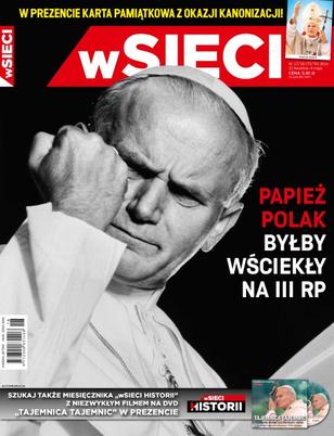 Papież Polak byłby wściekły na III RP – mieliśmy Go dla siebie 27 lat, bardziej niż inni, bo choć dźwigał na swych barkach Kościół powszechny, to przecież nie krył swej szczególnej więzi i szczególnej troski o nas, o Polskę; dziecięcy upór i zła wróżba – tylko u nas fragment wywiadu rzeki z Martą Kaczyńską, „Moi Rodzice” to przejmująca opowieść o domu pachnącym obiadem, polityce podglądanej z dziecięcego pokoju i szczęściu przerwanym przez rodzinny dramat; telenowela Jaruzelskiego – nie został bohaterem reportaży z sali sądowej, ale trafił do rubryk plotkarskich, czy ta telenowela ma służyć ociepleniu wizerunku towarzysza generała; Polacy toną w długach – kredyty gospodarstw domowych w bankach to dziś 550–560 mld zł, kredyty przedsiębiorstw sięgnęły 280 mld zł.
