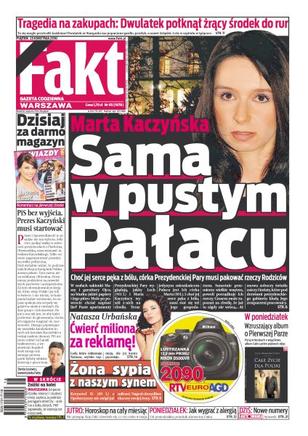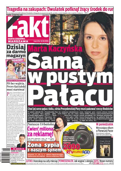 Córka Ewy Kopacz opowiada o koszmarze, który jej mama przeżyła w Rosji; Izabela Jaruga-Nowacka spoczęła na warszawskich Powązkach; córka Lecha i Marii Kaczyńskich zamieszkała w Pałacu Prezydenckim – musi teraz spakować osobiste rzeczy swoich zmarłych rodziców; niesforny wiatr zakłócił spacer państwa Komorowskich; okaleczony pacjent zawiadomił prokuratora o popełnieniu przez lekarzy potwornego błędu; UFO pod Zamościem – co się stało na polu w Niedźwiedziej Górze; Natasza Urbańska wzięła ćwierć miliona za reklamę; Kammel nie umie parkować roweru; wyniki bezpośredniego starcia dwóch najlepszych obecnie polskich zespołów może przesądzić, który z nich wygra ekstraklasę; amerykańscy trenerzy mówią o sobotniej walce Tomasza Adamka.