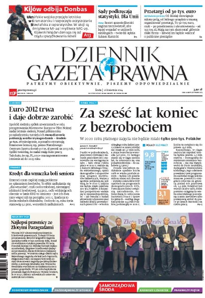 Za sześć lat koniec z bezrobociem – w 2020 roku płatnego zajęcia nie będzie miało tylko 500 tys. Polaków; Euro 2012 trwa i daje dobrze zarobić; kredyt dla wnuczka boli seniora; najlepsi prawnicy ze Złotymi Paragrafami; u kraińskie wojsko przejęło lotnisko w Kramatorsku i rozpoczęło oczyszczanie Słowiańska z separatystów; sądy podkręcają statystyki – dla Unii; przetargi od 30 tys. euro.