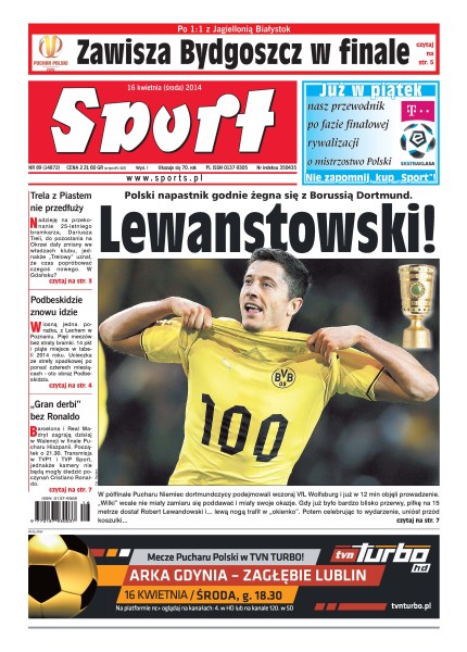 Robert Lewandowski godnie żegna się z Borussią Dortmund; nadzieję na przekonanie 25-letniego bramkarza, Dariusza Treli, do pozostania na Okrzei dały zmiany we władzach klubu, jednak…; ucieczka ze strefy spadkowej po ponad czterech miesiącach – oto obraz Podbeskidzia; Barcelona i Real Madryt zagrają dzisiaj w Walencji w finale Pucharu Hiszpanii.