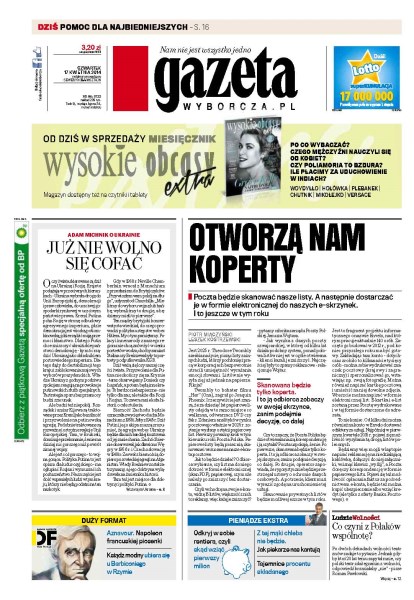 Poczta będzie skanować nasze listy, a następnie dostarczać je w formie elektronicznej do naszych e-skrzynek; katowicka policja zatrzymała 21-latka,którego podejrzewa o zgwałcenie 30 dziewcząt na Śląsku; prokuratura odpuszcza najważniejszy zarzut dla bohatera jednej z największych afer III RP Andrzeja Gąsiorowskiego; eurolisty są, można walczyć; w przeddzień dzisiejszych rozmów szefów dyplomacji Rosji, UE, Ukrainy i USA separatyści zadali władzom w Kijowie cios.