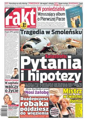 Katastrofa w Smoleńsku – wyjaśnienie przyczyn może zabrać śledczym nawet rok; czy Bronisław Komorowski podpisze nową ustawę o IPN; Wojciech Siemion walczy o życie po strasznym wypadku; odnaleziono miejsce pobytu zaginionego szyfranta polskiego wywiadu; ile musimy czekać na operację w polskich szpitalach; Agnieszka Radwańska ma swojego ochroniarza; Paweł Brożek chciałby grać jak Robert Lewandowski; Legia bez problemu rozprawiła się z Piastem Gliwice; zaczyna się Grand Prix na żużlu; seria zuchwałych napadów na banki w USA.