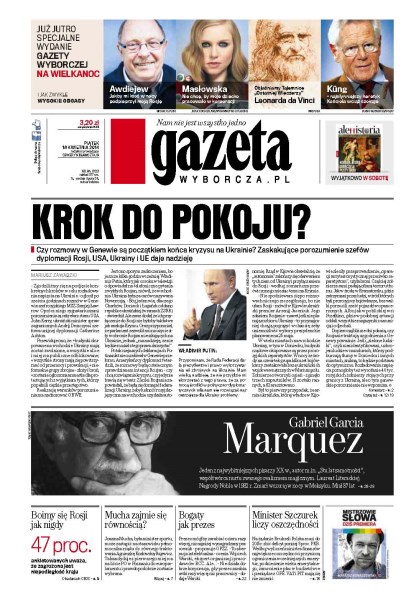 Czy rozmowy w Genewie są początkiem końca kryzysu na Ukrainie – zaskakujące porozumienie szefów dyplomacji Rosji, USA, Ukrainy i UE daje nadzieję; boimy się Rosji jak nigdy – 47 proc. ankietowanych uważa, że zagrożona jest niepodległość kraju; Joanna Mucha, była minister sportu, może zastąpić na stanowisku pełnomocnika rządu ds. równego traktowania Agnieszkę Kozłowską-Rajewicz; minister Szczurek liczy oszczędności; w Jasienicy odbędą się święcenia pokarmów w Wielką Sobotę i msza święta w Wielką Niedzielę, ale przed zamkniętym kościołem.