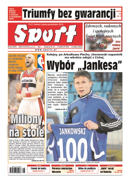 Maciej Jankowski związany z Ruchem Chorzów będzie jeszcze tylko przez dwa miesiące, a w środowisku słychać, że w nowym sezonie zagra już w innym klubie; Marcin Gortat po czterech latach przerwy znów zagra w play offie; Cionek do kadry; pierwsze zwycięstwo Warzychy; hokej – Wilno do podbicia.