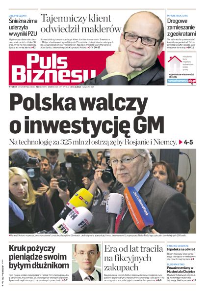 Mamy szansę na nowy projekt motoryzacyjny – GM chce jednak grantu, a resort finansów się krzywi; na klientach z odzysku banki położyły kreskę – Kruk bierze ich pod swoje skrzydła; zarzuty wobec Tomasza H. i Klausa T. to wierzchołek góry lodowej; materiały wzmacniające podłoże drogi budowanej przez hiszpański Dragados trafiły pod lupę GDDKiA; kryzys spowodował, że relacje między właścicielami obiektów handlowych i najemcami stały się bardziej partnerskie; inwestorzy budujący mieszkania już po raz szósty ocenili warunki współpracy z instytucjami finansowymi; wzrasta zainteresowanie najemców i inwestorów ekologicznymi biurami; co trzeci pytany pracownik biura maklerskiego nie wie, co to jest MiFID.