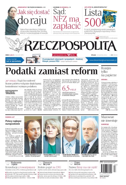 Podatki zamiast reform – rząd chce uzdrowić finanse państwa wyłącznie dzięki lepszej koniunkturze i wyższym podatkom; polscy najlepsi europosłowie – Konrad Szymański jest najlepszym polskim eurodeputowanym w rankingu dziennikarskim przygotowanym przez „Rz”; rozejm tylko na papierze – wynegocjowane zaledwie w czwartek w Genewie porozumienie o przywróceniu pokoju na Ukrainie już zostało zerwane; Mazowsze nie inwestuje – na żądanie izby obrachunkowej Mazowsze przygotowało program naprawczy swoich finansów, zakłada on, że do 2019 roku samorząd nie będzie realizował żadnych nowych inwestycji; sąd uznał, że NFZ ma zapłacić – gdy fundusz nie chciał zwracać za zagraniczne operacje zaćmy, sąd stanął po stronie pacjentów.