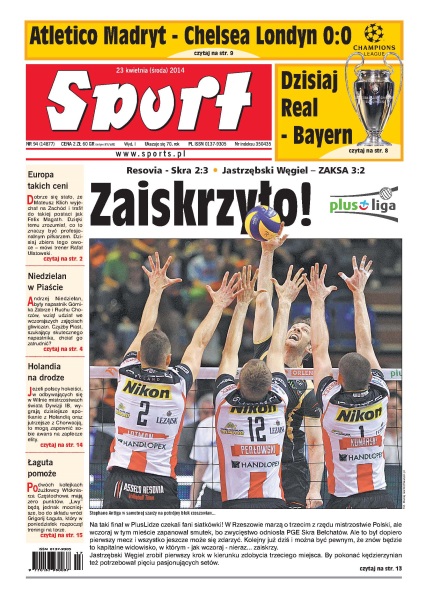 Zaiskrzyło – na taki finał w PlusLidze czekali fani siatkówki, w Rzeszowie marzą o trzecim z rzędu mistrzostwie Polski, ale wczoraj w tym mieście zapanował smutek, bo zwycięstwo odniosła PGE Skra Bełchatów; Europa takich ceni – dobrze się stało, że Mateusz Klich wyjechał na zachód i trafił do takiej postaci jak Felix Magath, dzięki temu zrozumiał, co to znaczy być profesjonalnym piłkarzem; Niedzielan w Piaście – Andrzej Niedzielan, były napastnik Górnika Zabrze i Ruchu Chorzów, wziął udział we wczorajszych zajęciach gliwiczan; Holandia na drodze – jeżeli polscy hokeiści, w odbywających się w Wilnie mistrzostwach świata Dywizji IB, wygrają dzisiejsze spotkanie z Holandią oraz jutrzejsze z Chorwacją, to mogą zapewnić sobie awans na zaplecze elity.
