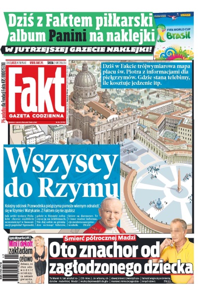 Wszyscy do Rzymu – kolejny odcinek Przewodnika pielgrzyma pomoże wiernym odnaleźć się w Rzymie i Watykanie, z Faktem się nie zgubisz; „Mini i dekolt zakładam celowo” – Agata Młynarska – zobacz, co chce udowodnić ociekająca seksem gwiazda; oto znachor od zagłodzonego dziecka – to Marek H. tak omotał rodziców maleńkiej Madzi, że własną córeczkę doprowadzili do głodowej śmierci – uwierzyli szamanowi, mimo że jego działalność wiąże się ze śmiercią innych dzieci; Kaczyńska dogadała się z mężem – jak mówią znajomi Marty Kaczyńskiej, ta kwestia spędzała jej sen z powiek, chodzi o wniosek męża Marcina Dubienieckiego, by po rozwodzie ich córki mieszkały częściowo u niego w Gdyni, a częściowo u niej w Sopocie.