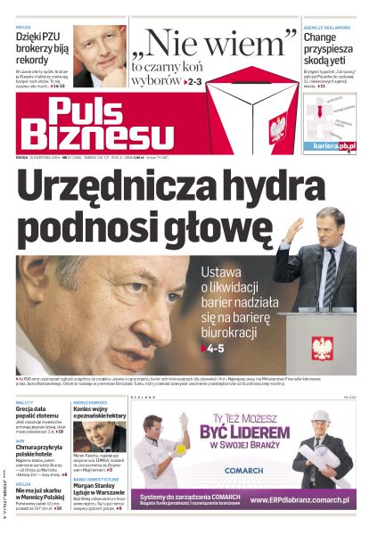 Kandydat PO ma największe szanse na zwycięstwo w wyborach prezydenckich; czarne chmury zawisły nad ustawą o wielkim sprzątaniu biurokracji w Polsce; Morgan Stanley otwiera biuro w Warszawie – z wielkiej 10 banków inwestycyjnych brakuje już tylko jednego; tydzień żałoby narodowej, a zaraz po nim chmura pyłu – to odbiło się na kieszeniach hotelarzy; resort skarbu pozbył się udziałów w Mennicy; polska grupa reklamowa znalazła się na prestiżowej liście najlepszych agencji na świecie; eksperci szacują, że dzięki zapisom na akcje PZU przybędzie nawet 100 tys. nowych rachunków; greckie kłopoty zdecydowanie pogorszyły nastroje na europejskich parkietach.