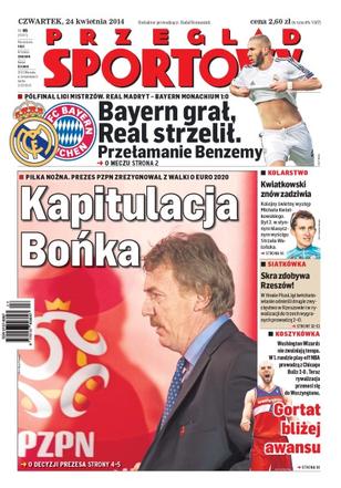 Kapitulacja Bońka – prezes PZPN zrezygnował z walki o Euro 2020; Bayern grał, Real strzelił – przełamanie Benzemy – w półfinale Ligi Mistrzów Real Madryt pokonał Bayern Monachium 1-0; Kwiatkowski znów zadziwia – kolejny świetny występ Michała Kwiatkowskiego, był 3. w słynnym klasycznym wyścigu Strzała Walońska; Skra zdobywa Rzeszów – w finale PlusLigi bełchatowianie odnieśli drugie zwycięstwo w Rzeszowie i w rywalizacji do trzech wygranych prowadzą 2–0; Gortat bliżej awansu – Washington Wizards nie zwalniają tempa, w 1. rundzie play-off NBA prowadzą z Chicago Bulls 2-0 – teraz rywalizacja przenosi się do Waszyngtonu.