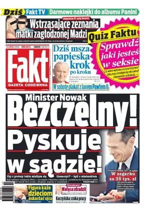 Minister Nowak bezczelny, pyskuje w sądzie – „Czy z protezy także miałbym się tłumaczyć?” – kpił z uśmieszkiem; wstrząsające zeznania matki zagłodzonej Madzi – Fakt dotarł do zapisu przesłuchania matki Madzi w prokuraturze; msza papieska krok po kroku – w dzisiejszym odcinku Przewodnika pielgrzyma tłumaczymy symbolikę mszy kanonizacyjnej; „Szanujemy prywatność wszystkich naszych użytkowników” – amerykański koncern Google odpowiada na list otwarty prezesa Axel Springer Matias’a Doepfner’a, nie godzi się z zarzutami, że jest monopolistą, który nadużywa swojej pozycji i może zagrażać naszej prywatności; przyszyli mu penis i spłodził synka – naukowa sensacja z USA, pierwszy taki przypadek na świecie.
