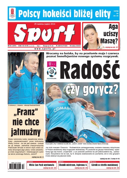 Radość czy gorycz – wracamy na boiska, by na przełomie maja i czerwca poznać beneficjentów nowego systemu rozgrywek; „Franz” nie chce jałmużny – słaba końcówki rundy zasadniczej ekstraklasy „zaprezentowana” przez krakowską Wisłę, mocno rzutuje na jej trenera; Giggs też ma czterdziestkę – przykład „Niebieskich”, którym właśnie wypłacono całkiem niezłe premie, pokazał, że po prostu opłaca się wygrywać; teraz pod Wawel – grające z nożem na gardle krakowianki zdołały odeprzeć atak miejscowych, o tytule zadecyduje piąty mecz w niedzielę w Krakowie; Aga twardo na ziemi – Radwańska wysyła ostrzeżenie do rywalek: „Na mączce też jestem mocna!” – dziś z Marią Szarapową zagra o półfinał turnieju w Stuttgarcie.