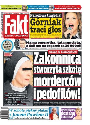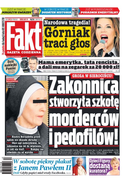 Zakonnica stworzyła szkołę morderców i pedofilów – siostra Bernadetta przed sądem nie okazała skruchy, choć sąd zadecydował, że zakonnica ma iść do więzienia, do celi nie trafi – kolejny raz odwołała się od wyroku; narodowa tragedia, Górniak traci głos – kto zaśpiewa hymn na zimowej olimpiadzie w Krakowie? – jak dowiedział się Fakt, Edyta Górniak nie jest zadowolona z tego, jak ostatnio zmienia się jej głos; czy dzieci Katarzyny Figury dostaną kuratora – dramat w rodzinie; mama emerytka, tata rencista, a dali mu zegarek za 20 tysięcy złotych – proces Sławomira Nowaka przynosi sensacyjne wątki, on sam zaś posiwiał i zmizerniał.