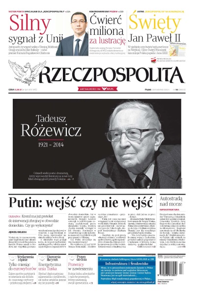 Putin się zastanawia nad wejściem na Ukrainę – Kreml ma już pretekst do interwencji zbrojnej w obwodzie donieckim, pytanie czy go wykorzysta; autostradą nad morze – przejazd samochodem między Warszawą a Gdańskiem zajmie trzy godziny 15 minut, Generalna Dyrekcja Dróg Krajowych i Autostrad chce 30 kwietnia oddać do użytku 19-kilometrowy fragment autostrady A1 od Włocławka do Kowala; silny sygnał z Unii – „Jest sposób, by wygrać walkę o Ukrainę, Mołdawię, Gruzję oraz zachodnie Bałkany” – mówi premier Rumunii Bogusławowi Chrabocie; tylko miesiąc do eurowyborów – zalew spotów partyjnych w internecie nie dociera do masowego wyborcy; energetyczna unia Tuska – słychać dyplomatyczne zapewnienia o życzliwości, ale żadne ustalenia jeszcze się nie pojawiły; prawnicy w zawieszeniu – rośnie liczba adwokatów i radców prawnych, którzy zawieszają swoje uprawnienia.