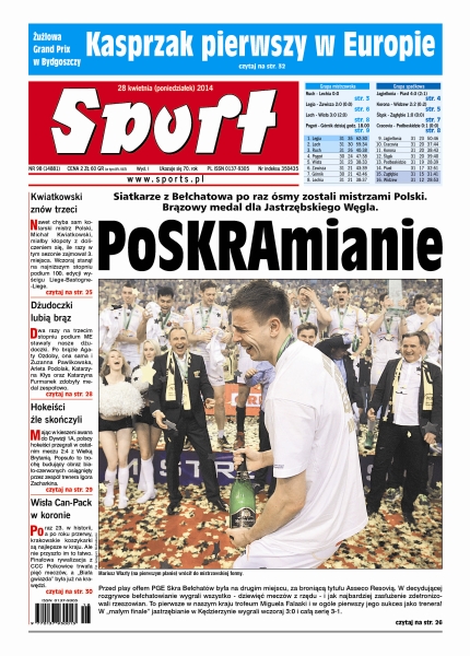 Siatkarze z Bełchatowa po raz ósmy zostali mistrzami Polski – brązowy medal dla Jastrzębskiego Węgla; Pep Guardiola uczcił pamięć zmarłego przyjaciela – w „polskim” meczu na BayArena padł remis; porażka Milanu z Romą wyprowadziła z równowagi reprezentacyjnego napastnika; Liverpool dał się przechytrzyć Jose Mourinho i stracił „pole position” na ostatniej prostej rywalizacji o mistrzostwo; po brązie Agaty Ozdoby żeńska drużyna dołożyła także brąz na zakończonych w Montpellier mistrzostwach Europy; Władimir Kliczko w piątej rundzie posłał na deski bardzo słabego Aleksa Leapai i obronił cztery mistrzowskie pasy; Krzysztof Kasprzak odniósł w Bydgoszczy pierwsze zwycięstwo w indywidualnych mistrzostwach świata i jest liderem cyklu.