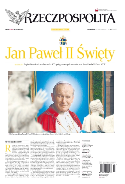 Dzień kanonizacji Jana Pawła II i Jana XXIII był jednym z najważniejszych dni w historii Kościoła katolickiego; łaski św. Jana Pawła II spłyną na nas i na całą Polskę – mają nadzieję Polki, które przyjechały na kanonizację; ZNP namówiło posłów, by zaskarżyli zmiany prawa, dzięki którym udaje się ratować wiejskie placówki; żołnierze Narodowych Sił Rezerwowych są sfrustrowani i zdezorientowani – co mogłoby uratować tę służbę; zapewne już w poniedziałek USA i Unia ogłoszą nowe sankcje wobec Rosji – czy Putin się już nimi nie przejmuje; zespół z Bełchatowa bez straty seta wygrał u siebie z Resovią i zakończył finałową rywalizację wynikiem 3:0; co się dzieje z Rafaelem Nadalem – mistrz kortów ziemnych przegrywa drugi raz w ciągu ośmiu dni, najpierw w Monte Carlo, teraz w Barcelonie.