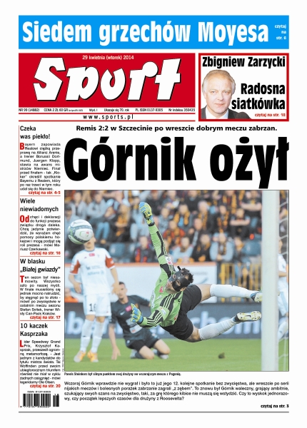 Remis 2:2 w Szczecinie po wreszcie dobrym meczu zabrzan; niemiecki klub zapowiada Realowi ciężką przeprawę na Allianz Arenie – trener Borussii Dortmund, Juergen Klopp, stawia na awans Bayernu; następca Alexa Fergusona wytrwał na stanowisku tylko 295 dni; Floyd Mayweather junior powalczy o 46. zwycięstwo; Zabrzanie rozpoczęli przygotowania do półfinałowej rywalizacji z Orlenem Wisłą Płock; ten sezon był niesamowity, wszystko szło po naszej myśli, a w finale musieliśmy się jednak mocno natrudzić mentalnie i fizycznie, by sięgnąć po to złoto – mówił po zwycięstwie w ostatnim meczu sezonu Stefan Svitek, trener Wisły Can-Pack Kraków; zakończony sezon należy ocenić pozytywnie, choć smutne jest to, że nikt nawet nie zbliżył się do wielkiej czwórki - twierdzi Zbigniew Zarzycki, mistrz olimpijski i świata, były trener reprezentacji.