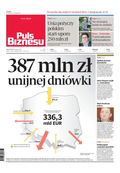 Unia pożyczy polskim start-upom 250 mln zł; nauka i biznes muszą iść w parze – mówi prof. Wiesław Nowiński; małe firmy lekceważą ryzyko w sieci – uważa Robert Żelazo z FireEye; kapitał, który napłynął do Polski podczas ostatniej dekady, pozwoliłby kupować co tydzień 4 nowe dreamlinery, a codziennie budować prawie 360 orlików, 12 dużych, nowoczesnych, świetnie wyposażonych szkół lub 10 km autostrady, która przez cały okres naszego pobytu oplotłaby niemal całą kulę ziemską; osiem lat temu projekt ustawy umożliwiającej bezrobotnym zawiązywanie spółdzielni socjalnych budził kontrowersje – dziś okazuje się skutecznym orężem w walce z bezrobociem; producentowi Frugo przydałby się energetyk na rozruch – firma znalazła się w finansowych tarapatach; Jan Paweł II gościł na znaczkach pocztowych tak często jak nikt inny – w całej historii światowej filatelistyki – 150 krajów wyemitowało ich ponad 2 tys. w przeszło 460 seriach.