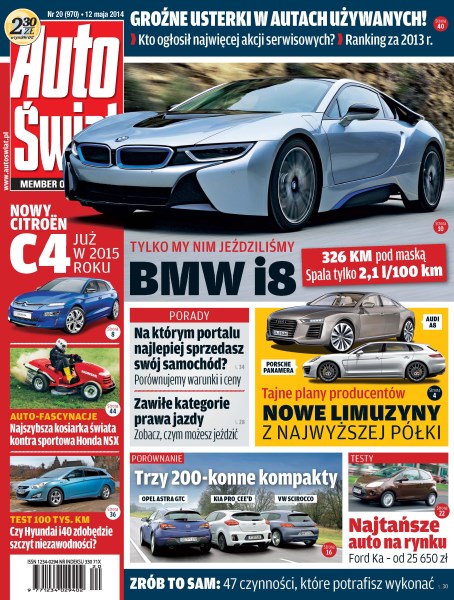 Audi A8 i Porsche Panamera – luksusowe limuzyny w nowym wydaniu; Citroën C4 – tak będzie wyglądała 3. generacja francuskiego kompaktu; BMW i8 – pierwsza jazda elektrycznym autem sportowym z Monachium; Ford Tourneo Courier – wrażenia z jazd wielofunkcyjnym Fordem; Range Rover Evoque – nowa wersja z 9-stopniowym „automatem”; Kia pro_cee’d, Opel Astra GTC i VW Scirocco – porównanie kompaktowych sportowców; Fiat Scudo – w 8-osobowej wersji Panorama Executive.