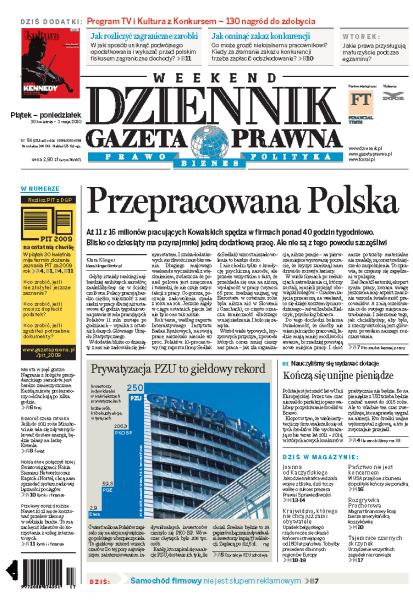 Aż 11 z 16 milionów pracujących Polaków spędza w firmach ponad 40 godzin tygodniowo, blisko co dziesiąty ma przynajmniej jedną dodatkową pracę; Polska nauczyła się w końcu rozsądnie wydawać unijne dotacje; prywatyzacja PZU to giełdowy rekord; co zrobić, jeśli nie zdążyłeś złożyć na czas zeznania PIT za 2009 rok; zwiększa się uzależnienie Mińska od Rosji; wzrastają opłaty, jakie pobierają banki za obsługę swoich klientów.
