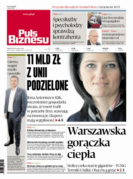 Wywiadownie gospodarcze prześcigają się w pomysłach na prześwietlanie firm; Barbara i Piotr Falentowie sprzedają za klientów niepotrzebne rzeczy; Ilona Antoniszyn-Klik, wiceminister gospodarki, uważa, że resort trafił w potrzeby firm, stawiając na innowacje – eksperci maja wątpliwości; zmiana klimatu na śródziemnomorski będzie sprzyjać hodowli, a włoski rynek dobrze zrobi biznesowi – uznała firma Snails Garden i otwiera ślimakowy kompleks w Tremoli; 553,5 tys. zł, prawie dwa razy więcej niż dopuszczalne przez prawo 3 proc. wartości majątku spółki – takie wynagrodzenie ma dostać syndyk PKS Zgorzelec; izraelski koncern farmaceutyczny chce rozbudować fabrykę w Krakowie.