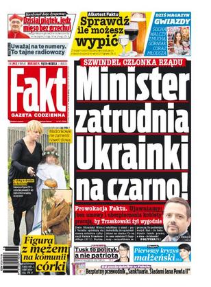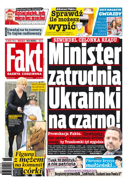 Minister zatrudnia Ukrainki na czarno; kardynał daje dyspensę: dzisiaj piątek, jedz mięso bez grzechu; uważaj na te numery, to tajne radiowozy; sprawdź, ile możesz wypić; Figura z mężem na komunii córki; Maleńczuk: Tusk to polityk, a nie patriota; Okupnik: pierwszy kryzys małżeński; przemiana Kasi Tusk; Bartosz Arłukowicz oszukał pacjentów: chorzy na raka czekają w kolejkach; siostry dręczycielki głodziły dzieci.