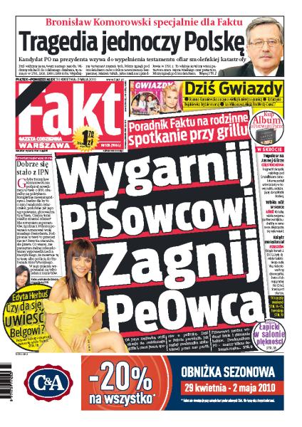 Bronisław Komorowski apeluje do Polaków, aby żal i gorycz po tragedii pod Smoleńskiem przekuć w energię do zmian na lepsze; Jarosław Kaczyński spędza całe dnie poza domem, nie chce być sam tam, gdzie wracają wspomnienia; jak będzie wyglądał nowy samolot dla prezydenta; kto kupuje zegarki za 400 tysięcy; Anna Mucha chodzi w butach za 1000 zł; Andrzej Łapicki wybrał się do kosmetyczki; poradnik Faktu na rodzinne spotkanie przy grillu.
