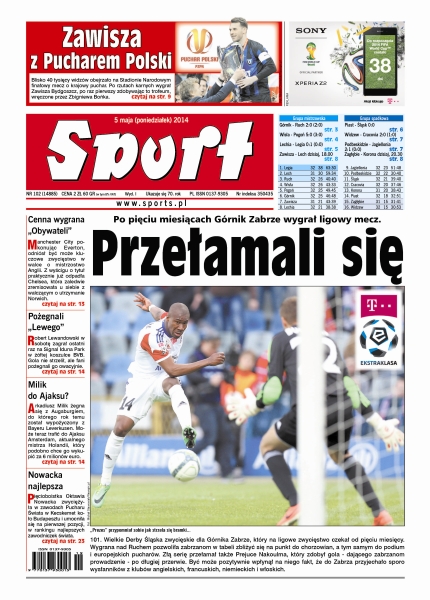 Po pięciu miesiącach Górnik Zabrze wygrał ligowy mecz; Igor Lewczuk nie miał problemów z udźwignięciem ciężaru odpowiedzialności w serii rzutów karnych – podobnie jak z udźwignięciem ważącego prawie 17 kg pucharu; Manchester City odniósł może kluczowe zwycięstwo w walce o mistrzostwo Anglii – z wyścigu o tytuł odpadła już praktycznie drużyna Chelsea; fani owacyjnie pożegnali Roberta Lewandowskiego; Łukaszowi Kubotowi nie udało się zakwalifikować do turnieju głównego w Madrycie; Aleksandra Urbańczyk i Paweł Korzeniowski zajęli pierwsze miejsca w klasyfikacji punktowej podczas zawodów Grand Prix Pucharu Polski; po trzech sezonach przerwy Mariusz Wlazły wraca do reprezentacji Polski; Michał Kwiatkowski, jadący przez dwa etapy w koszulce lidera, nie ukończył wyścigu Dookoła Romandii.