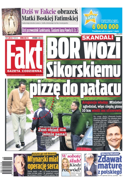 BOR wozi ministrowi pizzę do pałacu; mało pracy, dużo pieniędzy – polityków ciągnie do Brukseli jak pszczoły do miodu; Michał Kamiński jest rekordzistą – opuścił ponad 41 procent głosowań w europarlamencie; Młynarski w szpitalu – miał operację serca; wakacje w Egipcie są tańsze niż w Polsce; sędzia pedofil polował w internecie; córka Turskiego chce wygryźć Rozenek; Monika Richardson wzięła ślub – jak długo będzie panią