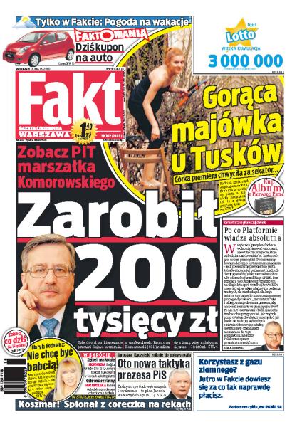 Zobacz PIT marszałka Bronisława Komorowskiego, kandydat na prezydenta RP zarobił 200 tys. zł; gorąca majówka u Tusków, córka premiera chwyciła za sekator; czy Jarosław Kaczyński ma realne szanse na zwycięstwo w wyborach prezydenckich; Amerykanie zbadają, czy system ostrzegania w prezydenckim samolocie działał prawidłowo; Artur Barciś złamał stopę; Lech Poznań coraz bliżej tytułu mistrza Polski.