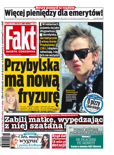 Przybylska ma nową fryzurę; zabili matkę, wypędzając z niej szatana; Cleo, musisz wygrać z panią Kiełbasą – „My, Słowianie” czarnym koniem finału konkursu Eurowizji?; nowy pomysły rządzie: więcej pieniędzy dla emerytów; rząd dał aferzystom 13 mln zł dotacji; Marta Kaczyńska uległa polityce: Kaczyński ubłagał ją, żeby przełożyła rozwód; Młynarski już zdrowy, wyszedł ze szpitala; Lewandowski walczy o armatę; Wisła popłynęła w Warszawie.