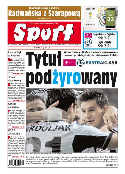 Wygrywając z Wisłą Legia mocno przybliżyła się do mistrzostwa Polski; w półfinale turnieju w Madrycie Radwańska zagra z Szarapową; do sporej niespodzianki doszło w inaugurującym 29. kolejkę I ligi meczu w Rybniku: broniący się przed spadkiem Energetyk ROW pokonał walczący o awans do ekstraklasy GKS Bełchatów 2:0; Robert Lewandowski chciałby godnie pożegnać się z Borussią Dortmund - może zostać najlepszym strzelcem Bundesligi; pierwsza sensacja w hokejowych MŚ elity w Mińsku, bo za taką można uznać porażkę (2:3) Kanady z Francją; Piotr Małachowski rzutem na odległość 66,72 m wygrał konkurs dyskoboli w pierwszym tegorocznym mityngu Diamentowej Ligi w stolicy Kataru Dausze.