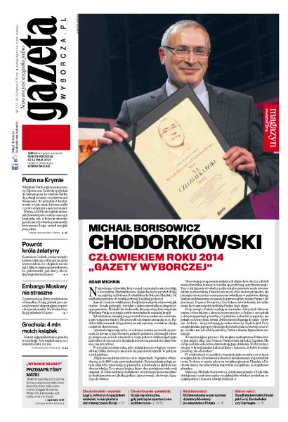 Michaił Borisowicz Chodorkowski Człowiekiem Roku 2014 „Gazety Wyborczej”; Putin na Krymie: Rosja defiluje, Ukraina walczy; Kazimierz Grabek, zwany niegdyś królem żelatyny, reaktywuje dawne biznesy; embargo Moskwy nie straszne; Katarzyna Grochola: 4 mln moich książek; tam, gdzie dwóch kandydatów PiS się bije; lek na zaufanie pacjenta; Ryszard Bugaj: wyższe podatki dla bogatych są konieczne; rozmowa z Morganem Freemanem; film, jakiego nie było, już w kinach: tak właśnie wyglądało Powstanie.