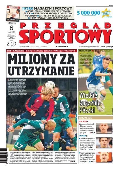 Niektóre kluby i zawodnicy z piłkarskiej Ekstraklasy mogą zarobić duże pieniądze za utrzymanie drużyny w lidze; Sławomirem Peszką interesują się Bayer Leverkusen i VfL Wolfsburg; Ireneusz Jeleń strzelił 14. gola w sezonie ale Auxerre przegrało 1:2 z Olympique Lyon; dziś pierwszy mecz o tytuł mistrza Polski siatkarzy; od nowego sezonu Legia Warszawa wróci do historycznego herbu drużyny.