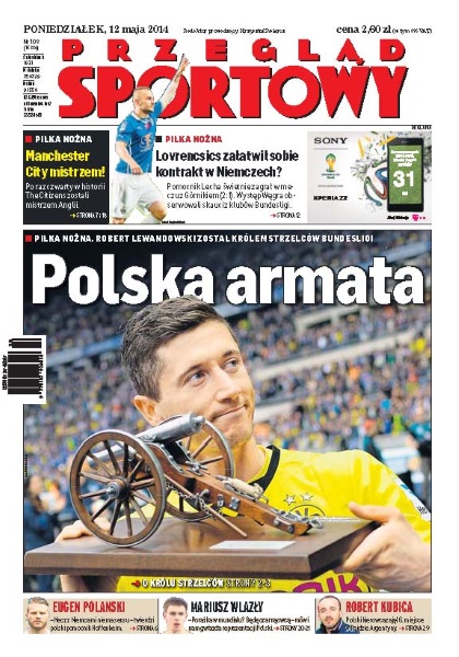Robert Lewandowski dokończył dzieła i został królem strzelców; już szósty raz nasz konsulat w Kolonii z PZPN zorganizował spotkanie z młodymi piłkarzami polskiego pochodzenia; piłkarze Manchesteru City na luzie pokonali West Ham i zapewnili sobie czwarte mistrzostwo Anglii; atakujący PGE Skry najlepszym siatkarzem PlusLigi; inteligencja, intuicja i talent Agnieszki Radwańskiej czasami giną w zalewie siły; Marcel Kittel wygrał już dwa etapy Giro d’Italia – liderem jest jednak Michael Matthews; w błocie i mgle legendarnego El Condor Robert Kubica zdobył 6. miejsce; pojedynek Lewisa Hamiltona i Nico Rosberga zdominował GP Hiszpanii.