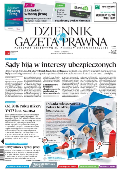 Klienci takich firm, jak AIG, Liberty Direct, Prudential czy Proama, nie zdają sobie sprawy, że w razie sporu sądowego będą musieli się procesować z ich zagranicznymi centralami – a to może oznaczać dla nich stratę czasu i pieniędzy; już w tym roku deficyt finansów publicznych może spaść poniżej wymaganych przez Unię Europejską 3 proc. PKB; z danych Eurostatu przeanalizowanych przez DGP wynika, że w latach 2003–2012 liczba zarejestrowanych przestępstw w naszym kraju zmalała o 24 proc.; agencja, która pomaga bezrobotnemu, nie będzie musiała zwracać pieniędzy za jego aktywizację, o ile tylko założy on fikcyjną firmę na 180 dni – może nawet w trakcie zawiesić działalność gospodarczą.