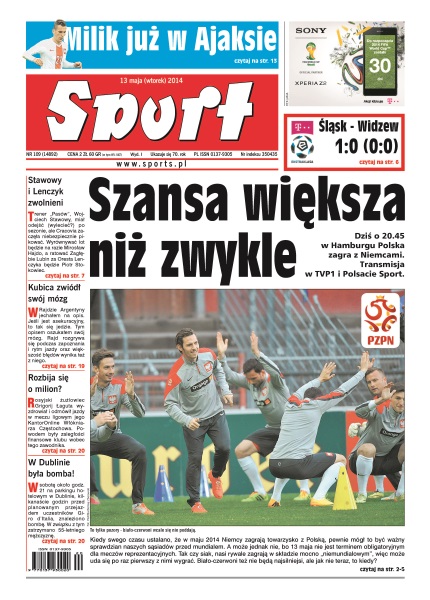 Dziś o 20.45 w Hamburgu Polska zagra z Niemcami – transmisja w TVP1 i Polsacie Sport; Joachim Loew odmienił oblicze reprezentacji – jednak pod jego wodzą piłkarze jeszcze nie wygrali mistrzowskiego turnieju; Michał Winiarski w każdym meczu jest filarem reprezentacji Polski – w tym sezonie będzie miał jeszcze więcej obowiązków; Washington Wizards, mimo 19-punktowego prowadzenia, po raz trzeci przegrali z Indiana Pacers – na więcej wpadek