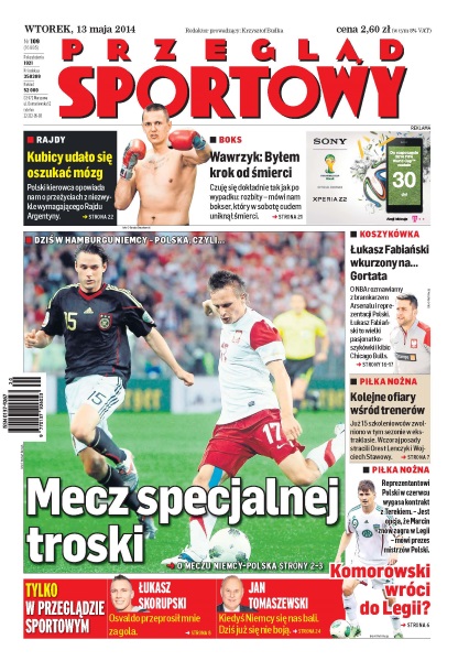 W osłabionych składach, w nieoficjalnym terminie i z nową nadzieją na poprawę gry w obronie – w czym dzisiejszy mecz z rezerwową reprezentacją Niemiec może pomóc Adamowi Nawałce; czyżby atmosfera w Piaście Gliwice była aż tak zła, że gdy tylko przyszedł nowy szkoleniowiec, drużyna poczuła ulgę i rozgromiła Cracovię; Marcin Gortat nie był pierwszym polskim koszykarzem w NBA, lecz został pierwszym, który zrobił tam karierę; Grzegorz Bociek może być pierwszym atakującym w eliminacjach mistrzostw Europy we Wrocławiu; Jerzy Janowicz przegrał 9 kolejnych spotkań; w mistrzostwach świata elity w Mińsku Rosjanie zrewanżowali się USA za porażkę w ćwierćfinale czempionatu globu 2013.