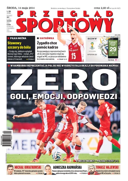 Trzeci raz zremisowaliśmy na wyjeździe z Niemcami i trzeci raz w Hamburgu – to jedyne korzyści z przedostatniego naszego testu w tym sezonie; Hubert Wołąkiewicz lub Mateusz Możdżeń – któryś z nich zastąpi w pomocy Łukasza Trałkę; Benfica chce dziś przerwać fatalną passę w europejskich pucharach; Choć jeszcze niedawno wydawało się to nierealne, rozgrywający Łukasz Żygadło w ekspresowym tempie wrócił do zdrowia i ma szansę zagrać w polskim mundialu; Agnieszka Radwańska na Foro Italico nie wygrała meczu od 2010 roku; Malcolm Wilson, szef przygotowującego auto dla Roberta Kubicy zespołu M-Sport, po występie w Argentynie nie musiał bronić kierowcy; w mistrzostwach świata elity na Białorusi pierwsze zwycięstwo Finów, którzy dali łupnia niepokonanym Niemcom.